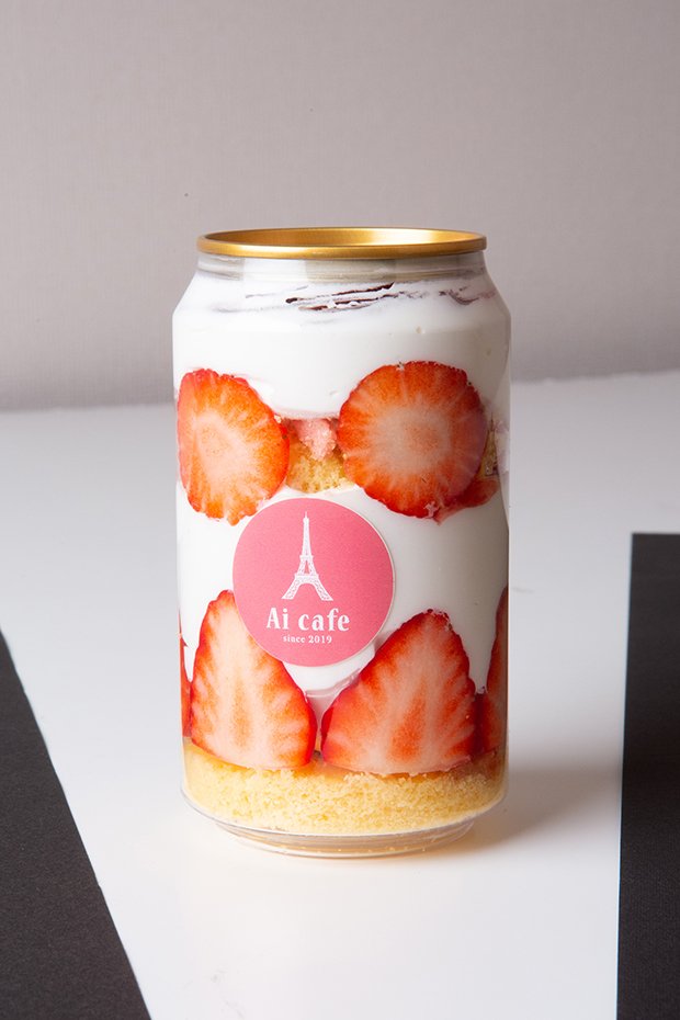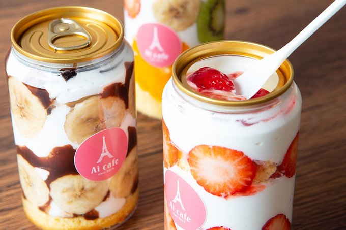 「パフェ缶 いちご」(手前右、800円)ケーキ1.8個分のボリュームがあり、食べ応え十分。ほかにフルーツミックス、チョコバナナもある