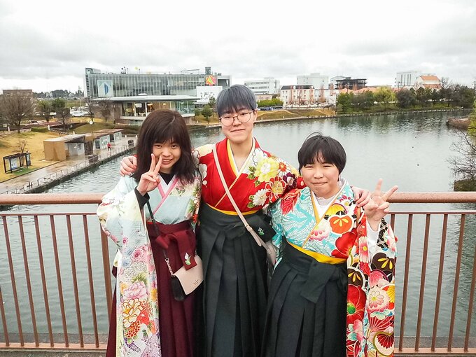 県内の専門学校を卒業した同市の女性(19)は、赤地にピンク色の花の柄が大きくあしらわれた振り袖と、深い緑色の袴を身に付け、母と一緒に会場内を歩いた。「専門学校の卒業式は袴姿で出席できなかったので、ぜひ着てみたかった。いい思い出になりました」と語った。