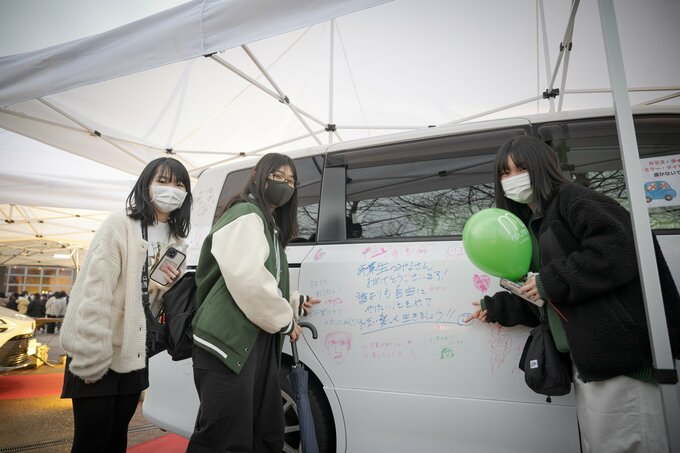 「メッセージカー」は展示したミニバン「ノア」の車体に、来場者から自由にメッセージを書き入れてもらった。「BEST FRIEND これからもずっと友達」「富山THANK YOU 就職しても頑張るぞ」「前を向いて元気に 毎日頑張ってください」など、友人、後輩、先輩、家族への言葉が車両を埋めた。