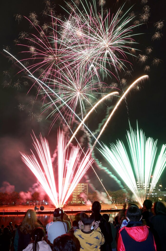 卒業生の門出を祝う「希望の光 エール花火」が18日、富山市の富岩運河環水公園であった。音楽に合わせて花火が打ち上げられ、集まった若者や家族連れが、夜空と水面を彩る大輪を楽しんだ。