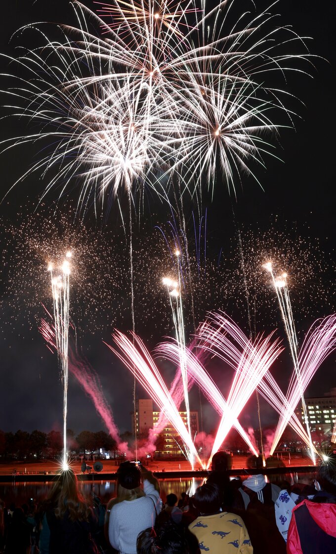 午後6時40分から15分間、花火が上がり、県内の中学3年生や高校3年生などから募ったメッセージを披露。家族や友人への感謝、新生活へのエール、新型コロナウイルス禍での苦労をねぎらうメッセージなどが読み上げられた。