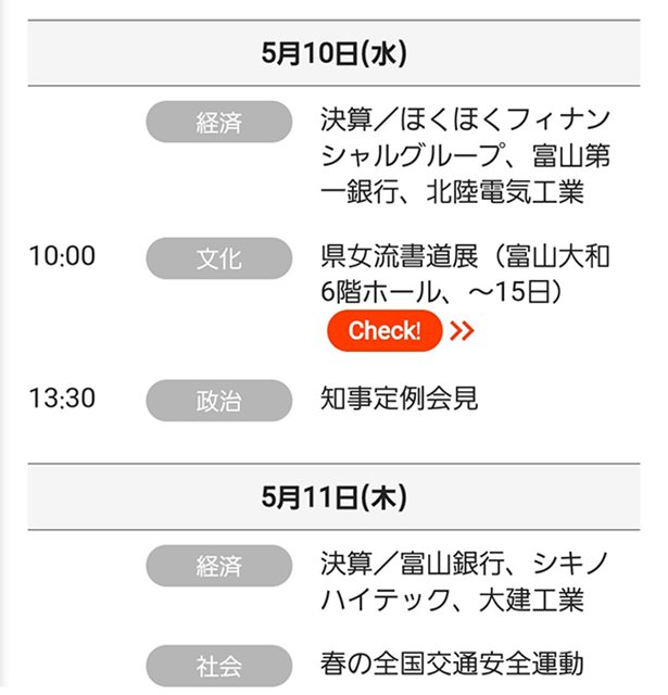 政治や経済、社会、スポーツ、文化、地域の予定が「日」「週」「月」単位のカレンダー形式で見られます。「富山県内」と「全国・国際」の予定を分けて表示。プレミアムプランの方は赤色の「Check!」マークを押すと、ニュースの見通しを解説した「先読み記事」が読めます。予定は随時更新します。