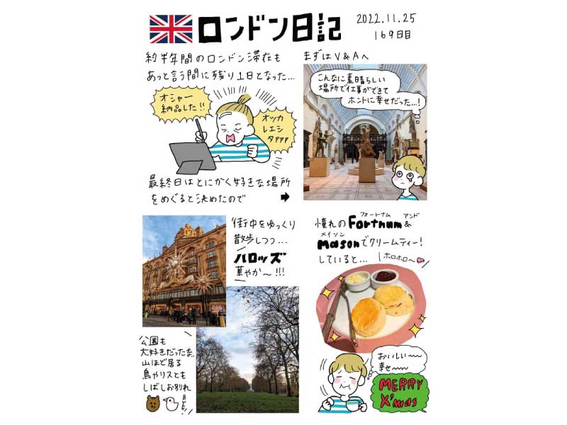2022年6月から約半年、ロンドンのシェアハウスの一室を借りて生活した。ロンドン暮らしの日常や感動を「ロンドン日記」につづり、3月末までに電子書籍全3巻を発表。家探しの苦労、水回りのトラブルから美しい風物、さまざまな人との出会いまで、イラストと写真を交えて紹介した。帰国後、漫画サイト「よめるも」にて1960年代の英国を舞台にした「THE SWINGING CITY」を連載している。