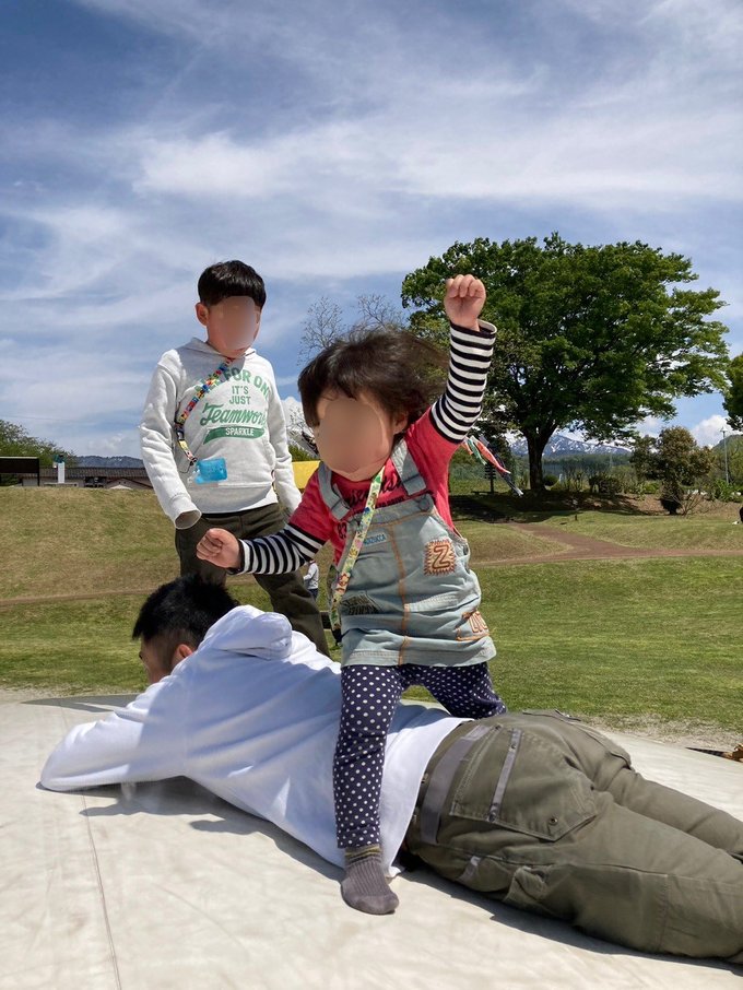 去年までは、富山県総合運動公園のふわふわドームに行っていましたが、今年の4月中旬に行ったときには、修理中になっていて遊ぶことができませんでした。しばらくは遊べなさそうな雰囲気に子どもたちはガッカリ・・・