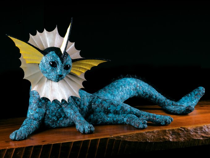 とりわけ目を引くのが、金工家の吉田泰一郎による彫像だろう。イーブイと、その進化形3体を表現している。シャワーズは、つぶらな瞳で正面を見据えながら、体を横たえる。仏像のような静けさを帯びつつ、人魚のような艶めかしさもある。
