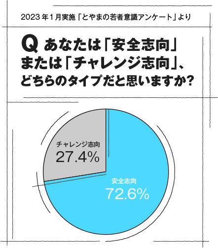 チャレンジしたい人と安定したい人の割合が1対3ですか。「若い人なのに」と驚く一方で、「そうだよね」とも思います。楽ですからね。でも、私はチャレンジをした方が心の安定を望めると思います。失敗しても、経験したことで充実感を得られると思うから。何かを諦めて得た安定は続かないと思います。
