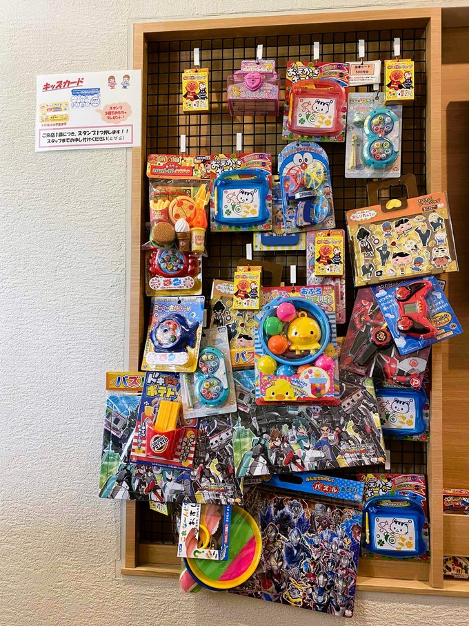 来店ごとにスタンプを1つ押してもらえて、5つ貯めるとおもちゃをプレゼントしてもらえます。壁にかけられているおもちゃの中から選べるのですが、種類が多くて毎回息子はどれにするか、ウキウキしながら悩んでいます。