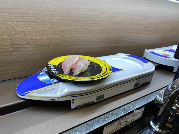 富山は美味しい回転寿司のお店が多いので、どこへ行くか、迷うのですが、我が家の鉄道好きの息子のハートをガッチリつかんで離さないのが『回転寿司すし食いねぇ!』です。息子に「お昼何食べる?」と聞くと、必ず「新幹線のお寿司」と返ってくるくらいですから。