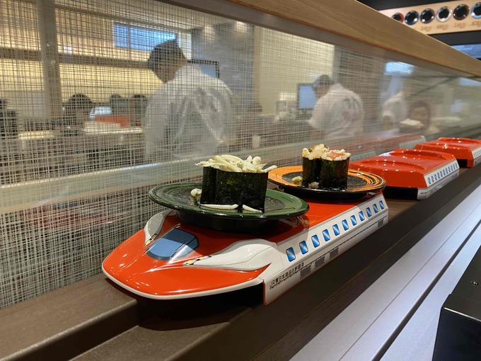 新幹線のお寿司、でピンときた方も多いでしょう。そう、こちらのお店では、タッチパネルで注文すると、新幹線がお寿司を運んできてくれるんです!