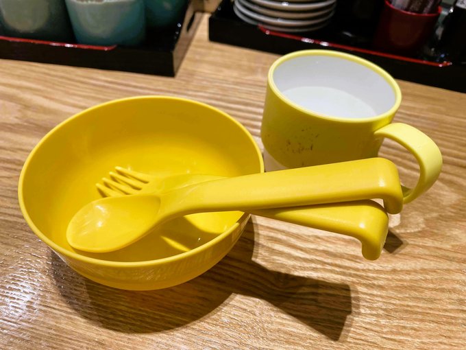 子供用のプラスチックのコップ、お椀、フォークやスプーンはもちろん、うどんを短く切る道具も貸してもらえます。