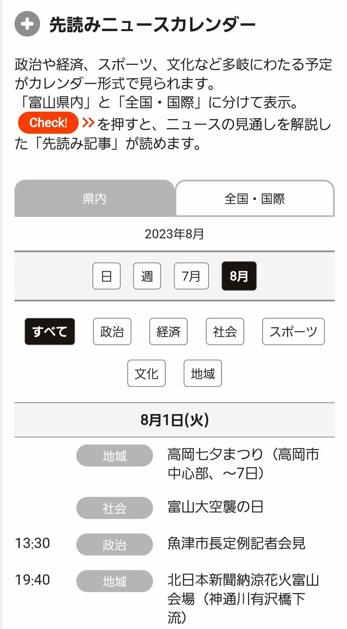 政治や経済、社会、スポーツ、文化、地域の予定が「日」「週」「月」単位のカレンダー形式で見られます。「富山県内」と「全国・国際」の予定を分けて表示。プレミアムプランの方は赤色の「Check!」マークを押すと、ニュースの見通しを解説した「先読み記事」が読めます。予定は随時更新します。
