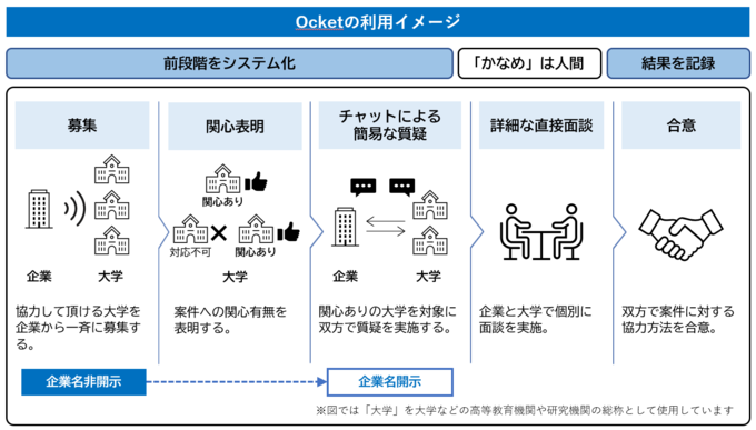 具体的に言うと、まず企業が産学連携で取り組みたい事項を専用のフォームに入力します。これを見た大学の担当者が協力できると判断したら、「関心あり」と意思表示する。その後、システム上のチャットを使って簡単な質疑をし、直接面談で詳細を詰め、条件面などで合意できれば具体的な連携に入ります。