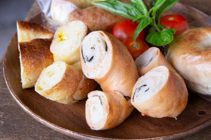 ベーグルの「地物とうもろこし」(1個290円、左)、「うちの畑のトマト&バジル」(1個270円)地元や自家栽培の野菜を使用。素材の甘みや香りが浮かび上がる