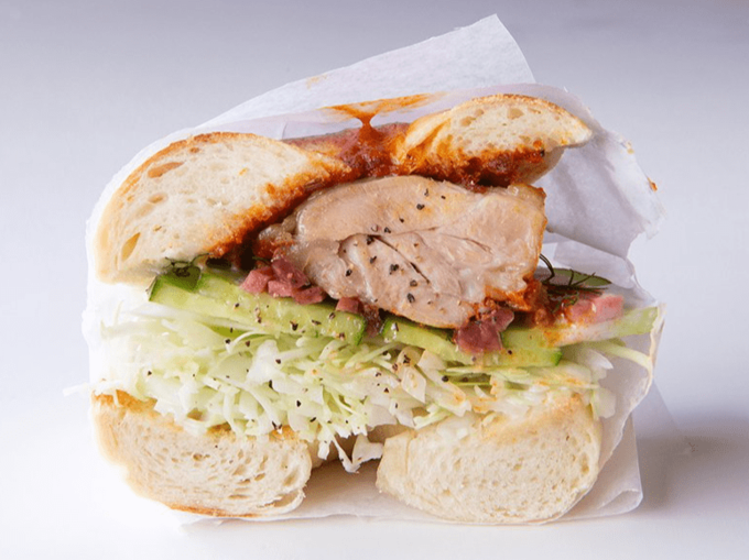 ベーグルサンド「タンドリーチキン」(2切れ680円)注文ごとにベーグルを温めて具材を挟むので、外側がパリッと香ばしい