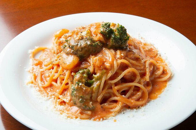 「鶏肉とブロッコリーのトマトクリームパスタ」(1,000円、サラダとスープ付き)選べるランチメニューの一例。濃厚なトマトクリームソースがもっちりとした麺によく絡む