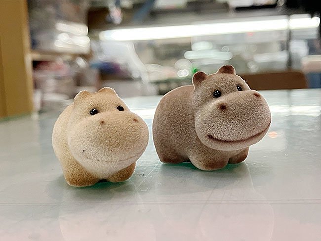 例えば、フロッキー(起毛加工)のカバのマスコット。コロナ禍の最中、SNSのX(旧ツイッター)にアップされた写真が注目され、知る人ぞ知る人気商品となった。