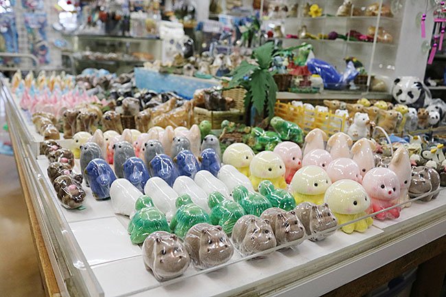 魚津水族館に隣接する土産店「真珠コーナー」(魚津市三ケ)は土産の枠に捉われない品ぞろえを誇り、全国からファンがやって来る。1メートル超のカメの標本、宝石・原石、化石、起毛加工(フロッキー)の動物マスコットなど、多種多様な物・物・物が店内を埋め尽くす。いったい、なんの店なの?