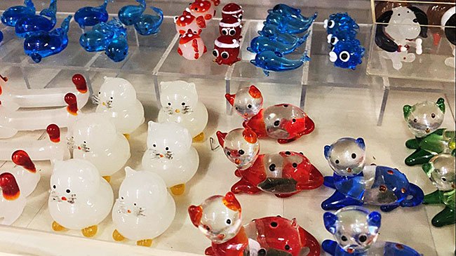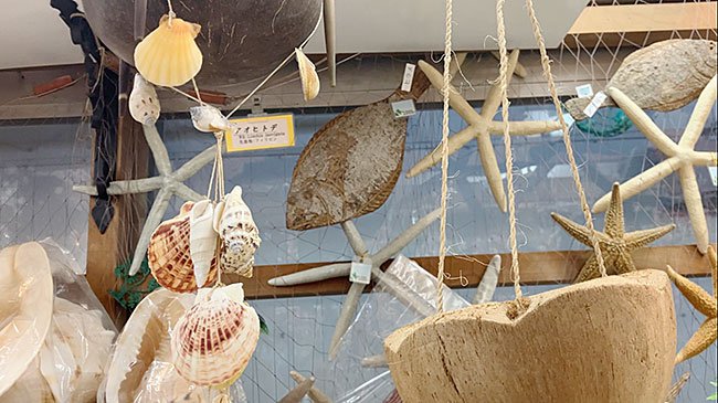 入るやいなや、商品の多さに圧倒された。ガラスの風鈴、貝殻、鉱物、ガラス細工の動物、恐竜の歯の化石、自社生産している魚津市のキャラクター「ミラたん」のぬいぐるみ…。見上げれば、ヒトデやハリセンボンのはく製も。雑多極まりない。