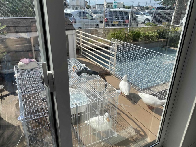 窓の向こうに真っ白なアヒルを発見!