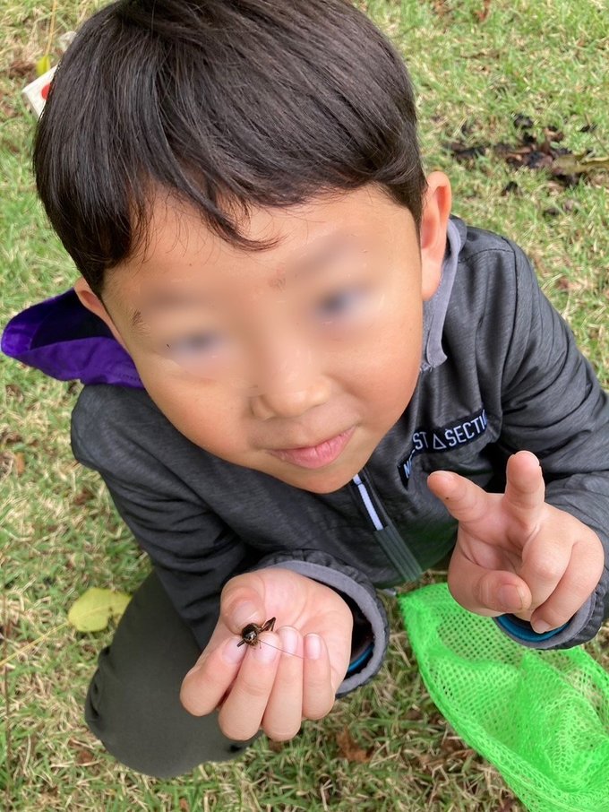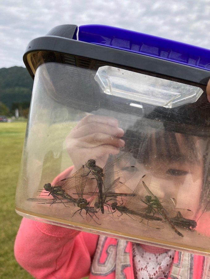 翌日は虫捕りに精を出し、たくさんの虫を捕まえていました。秋ということもあってか、トンボがたくさんいました。最後には、全て逃しましたが、虫かごいっぱいのトンボはインパクトがありました。
