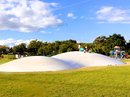 二つの山のふわふわドームに加え、ピラミッド状のロープを登って遊ぶ「ザイルクライミング」、アスレチック遊具など充実した設備がそろう。隣には屋内遊具場「遊ぼ~館」があり、急に天気が崩れても大丈夫。