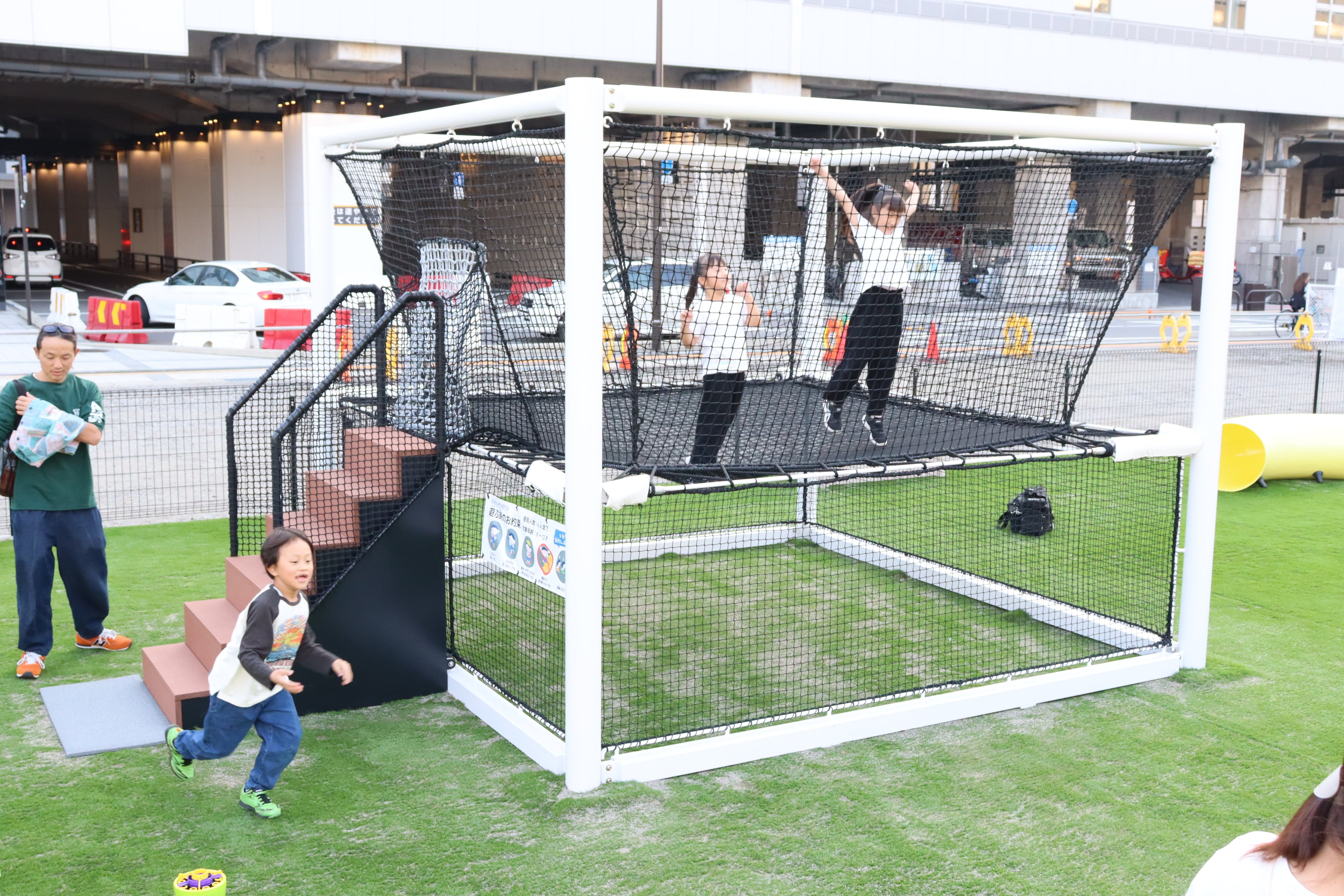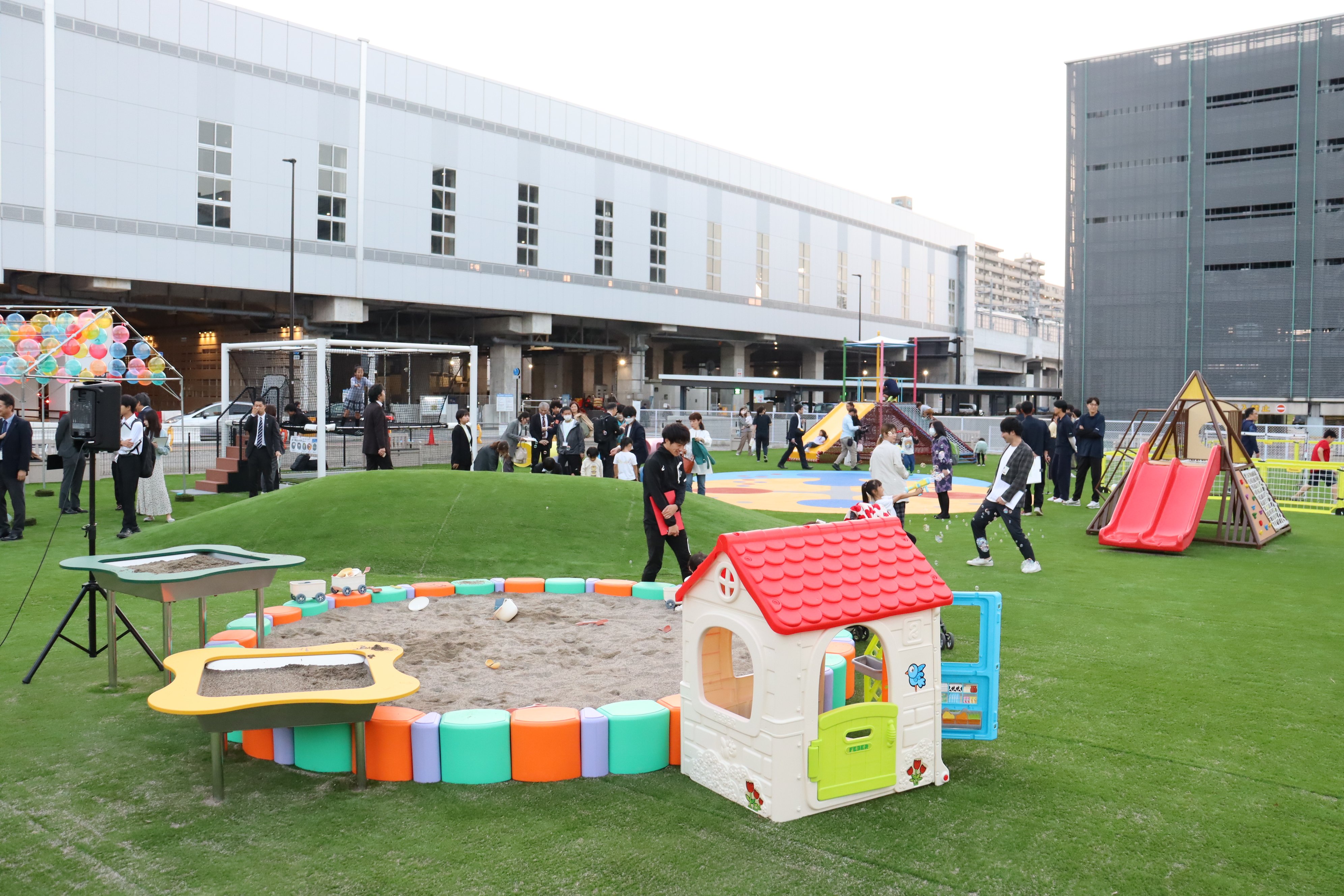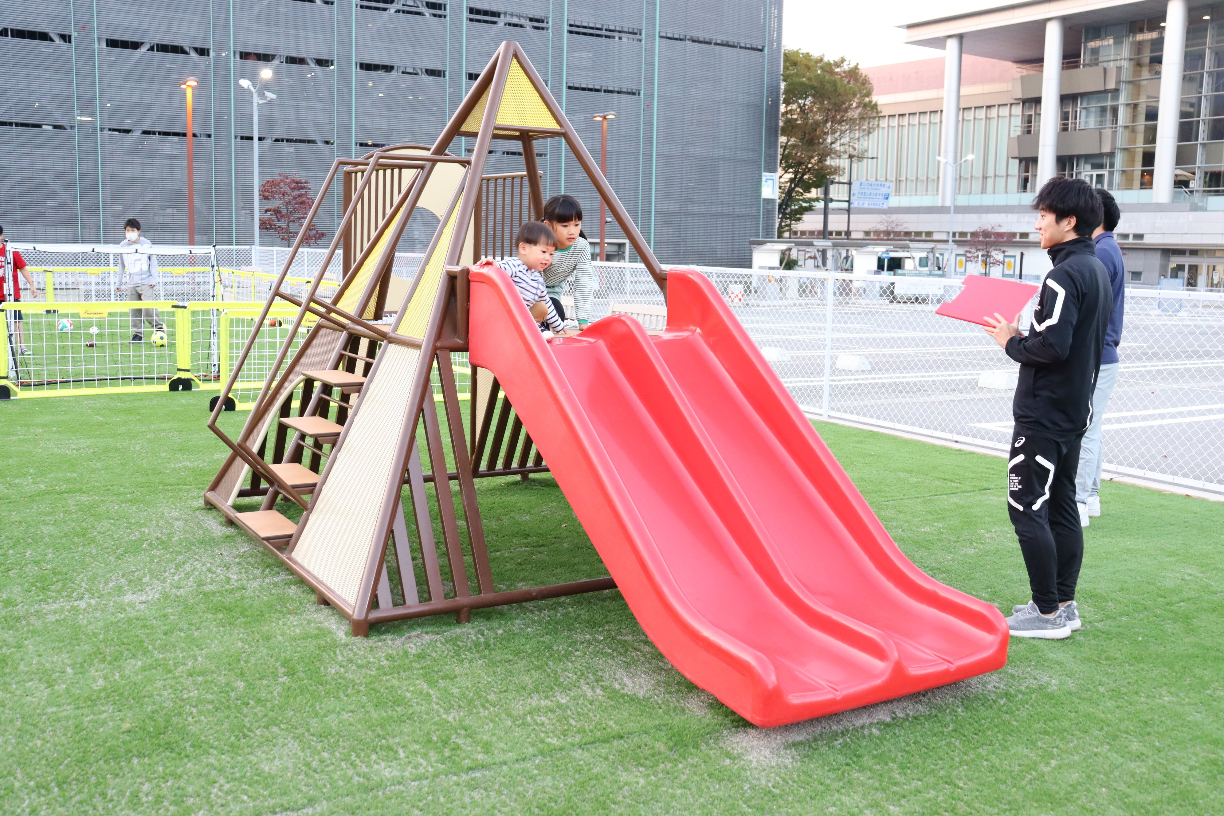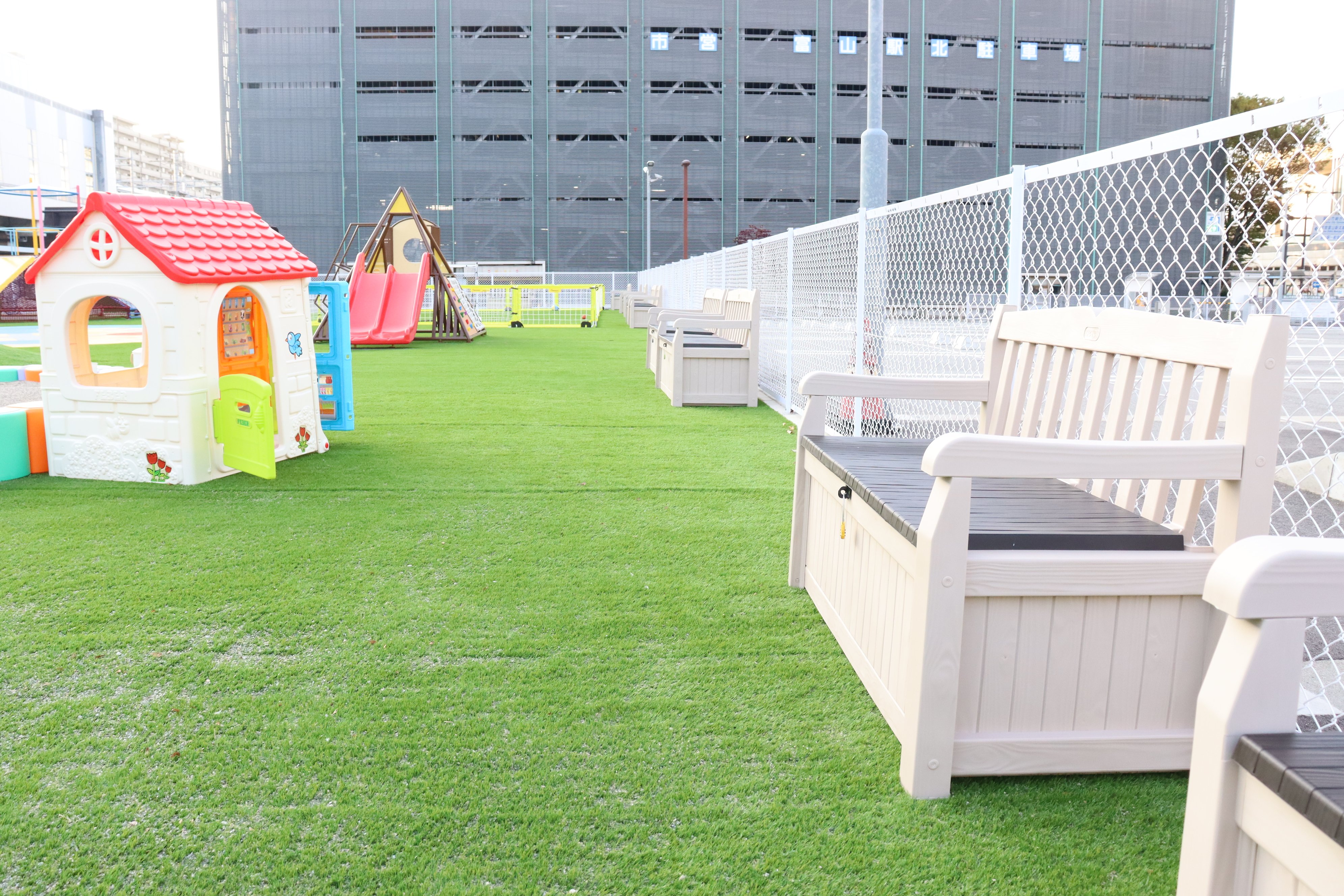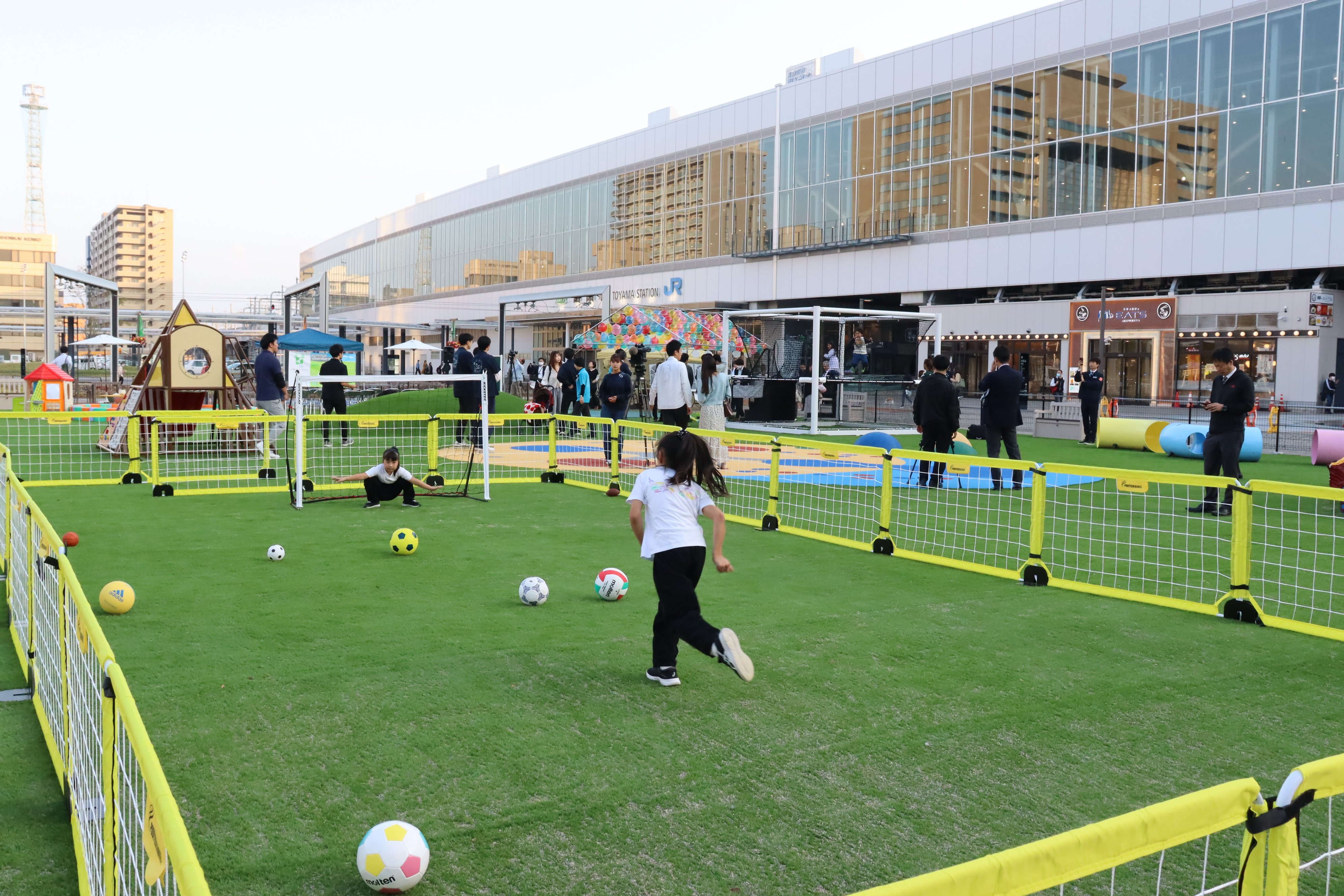 ごっこぱーくは、小学生以下を対象とした有料施設(子ども1時間500円 ※各種割引制度あり)で、JR富山駅北口を出て左手のエリア「牛島パークフロント」内の約850㎡に整備されました。全面が人工芝に覆われ、伸び伸びと駆け回ることができます。