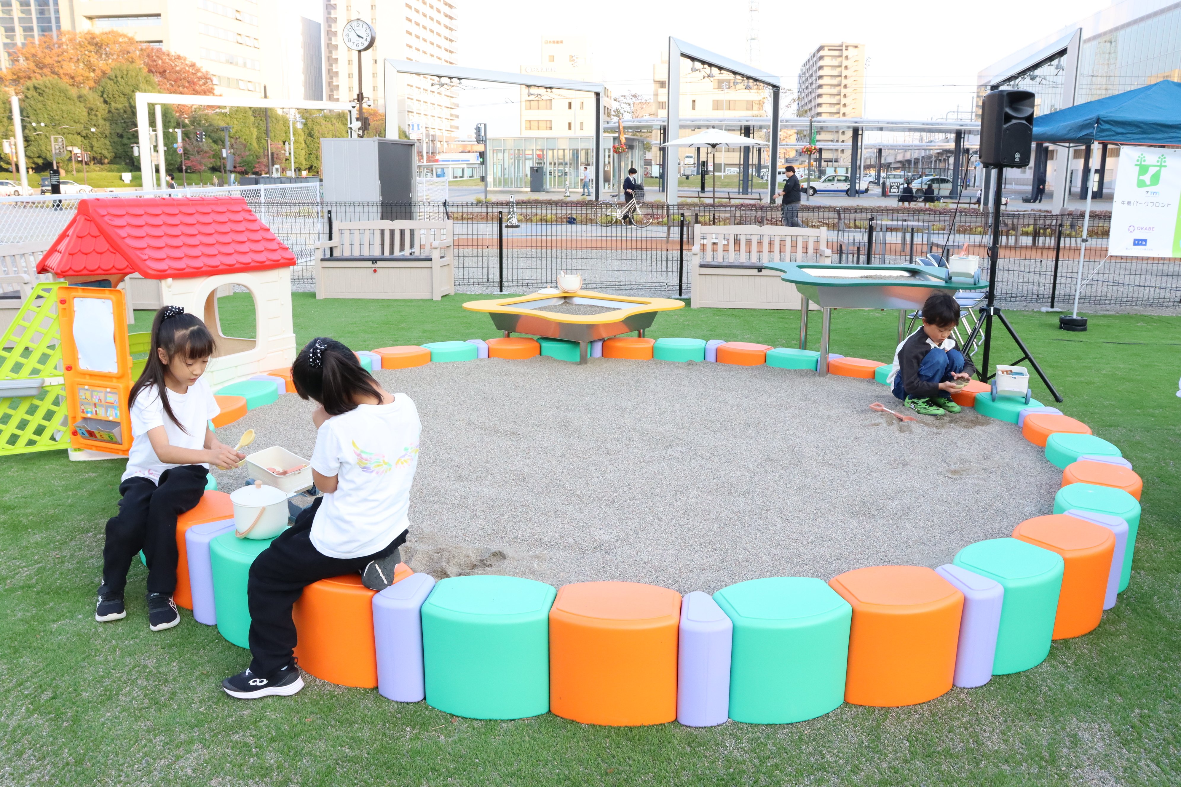 ごっこぱーくの周囲には柵が設置されていて、子どもが急に飛び出したりする心配もありません。また、見守りや休憩のできるベンチが多数あるのも、保護者にとってはうれしいポイント。爽やかな秋晴れの日に、おでかけしてみてはいかがでしょうか。