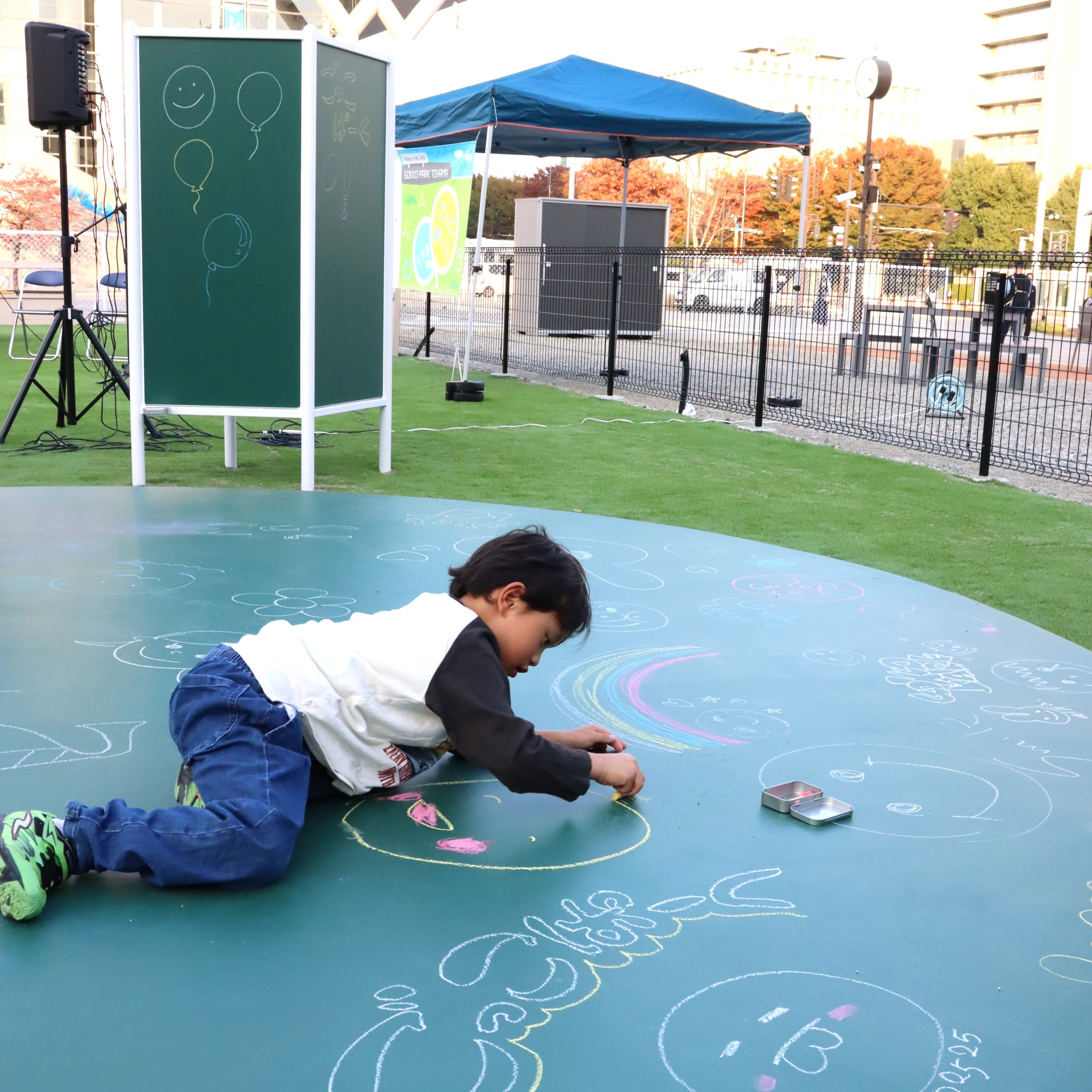 地面に設置された丸い大きな黒板は、自由に落書きOK!運動が苦手なお子さんも楽しめます。車いすのままでも利用できるよう、立体的な落書きボード(写真奥)を併設しています。
