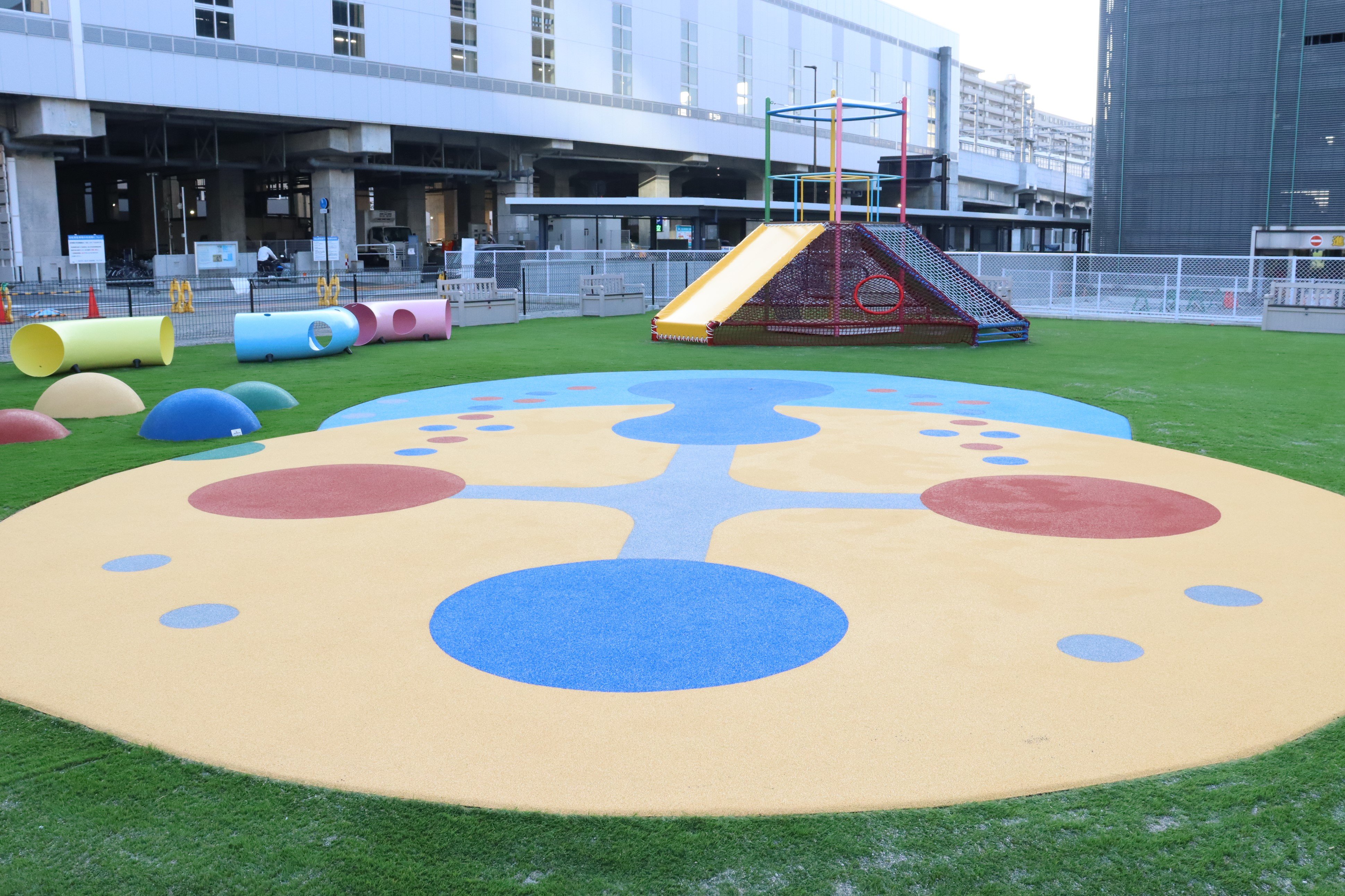 柔らかいゴムチップが敷かれた「ごっこアイランド」には、カラフルで不思議な模様が。このデザインを生かして「色鬼」のような自由な遊びを生み出してほしいという願いが込められています。近くにはゴムチップの小山「ぽっこりカメポン」(写真左)もあり、こちらと組み合わせて遊ぶのも楽しそうです。