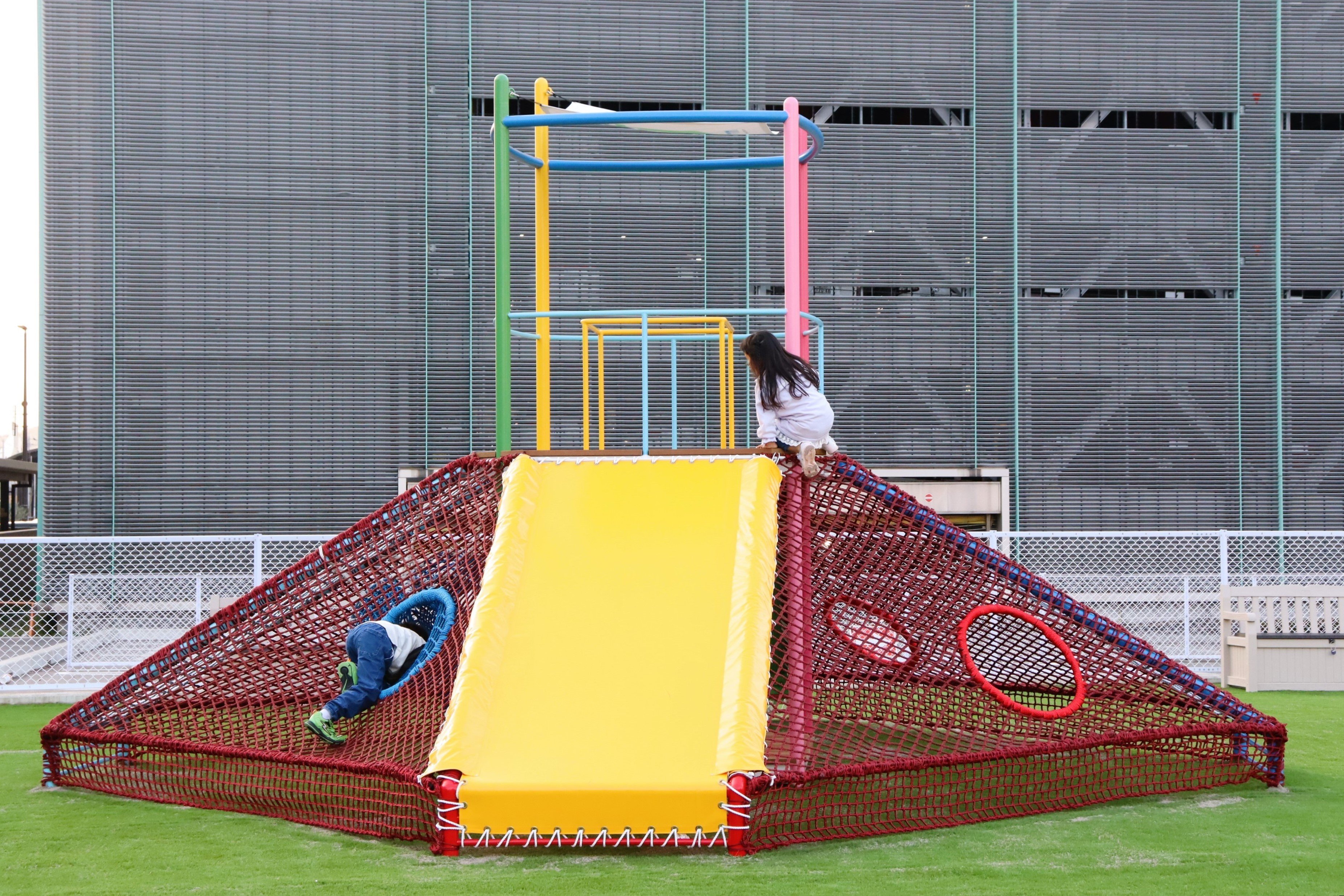 友だちと一緒に滑り降りられる幅広の滑り台やネットを組み合わせた複合遊具。ネットの内側に入って「秘密基地」のような遊び方をすることもできます。