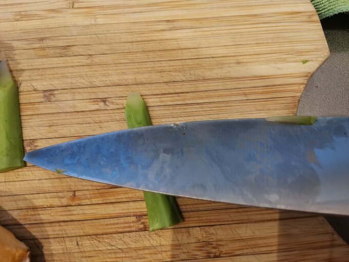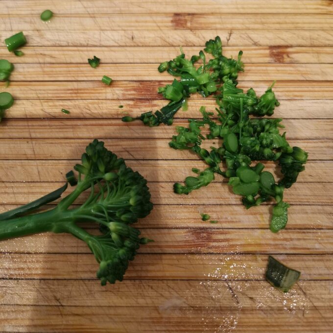 まな板の上に、みじん切りにしたブロッコリーを広げ、ジャガイモを転がすと簡単に付きます。