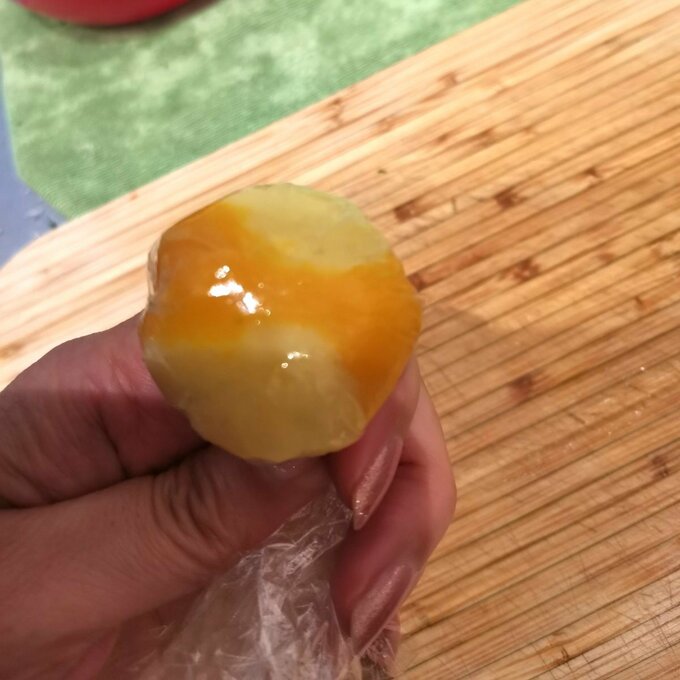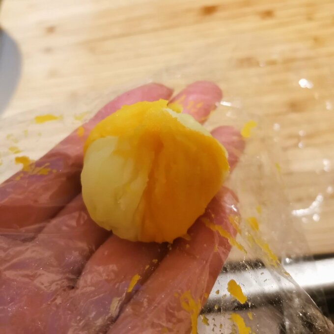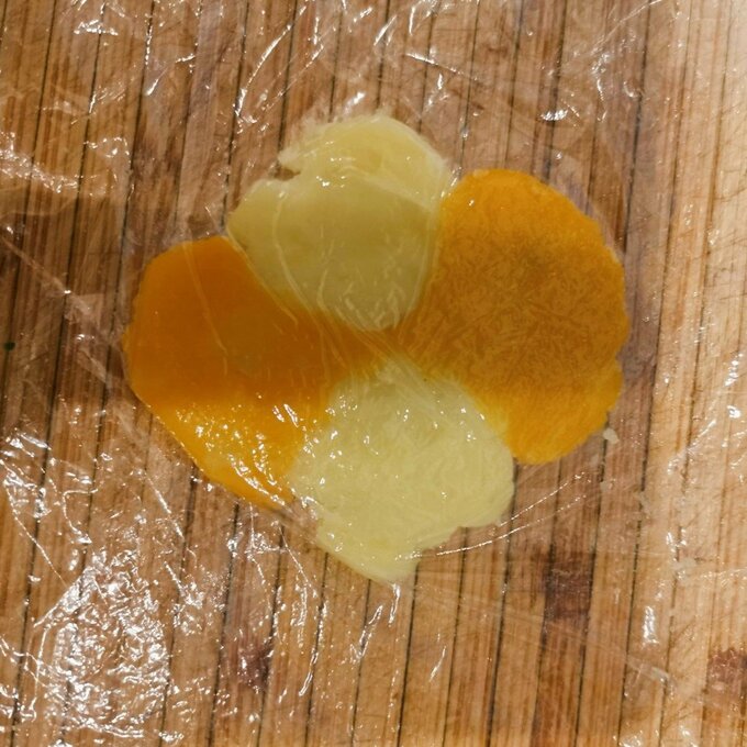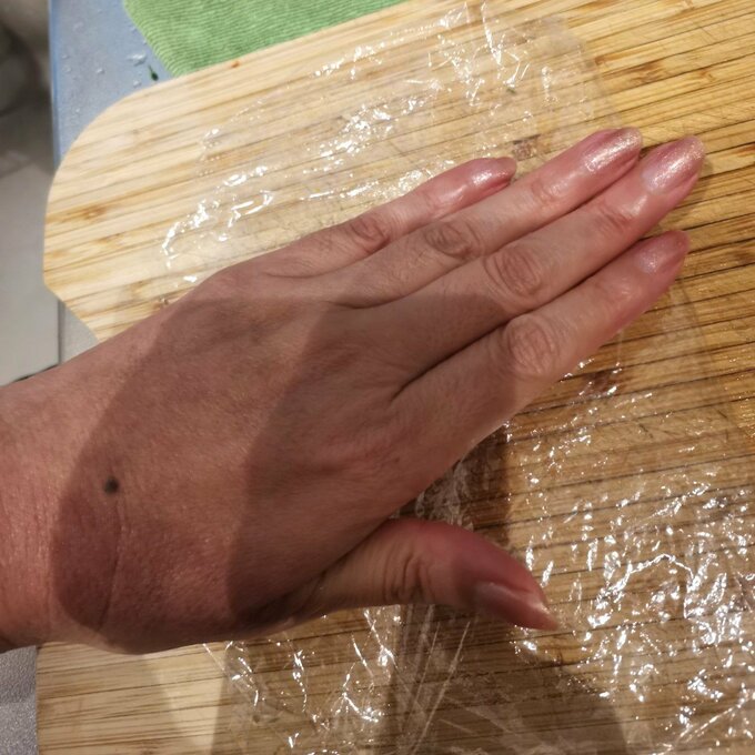 上にもラップをかぶせ、上からまっすぐ掌で潰します。平らになるよう、お皿の裏などで押し付けても綺麗にできます。
