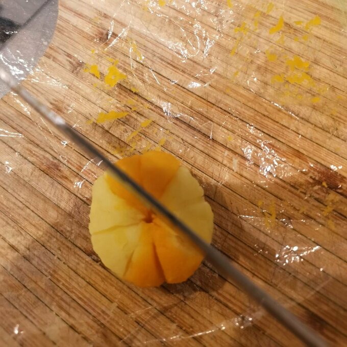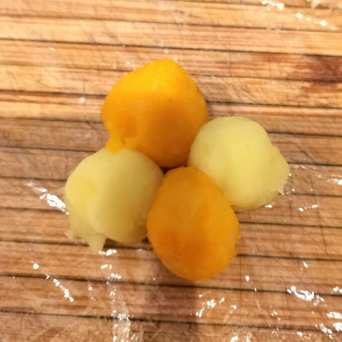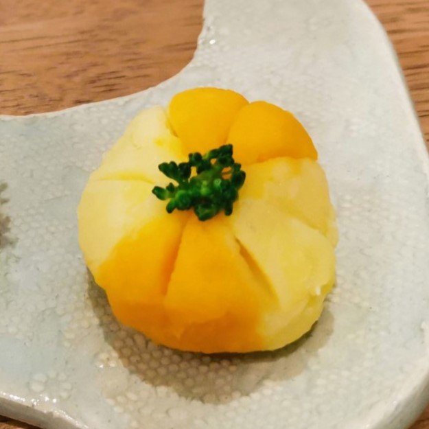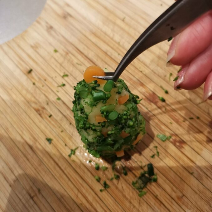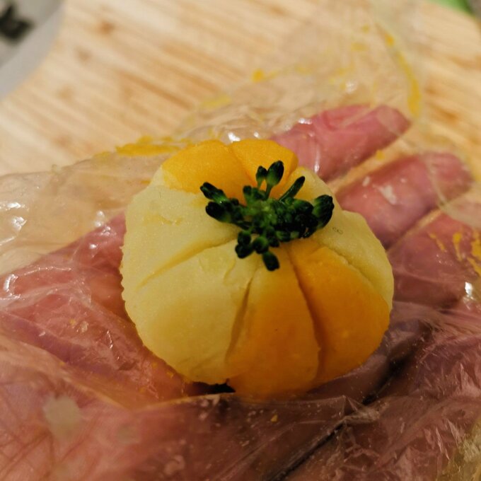 ぎゅっと捻って、茶巾絞りでもいいし、ナイフで模様を付けて中央にブロッコリーを添えて和菓子風にしても可愛いです。