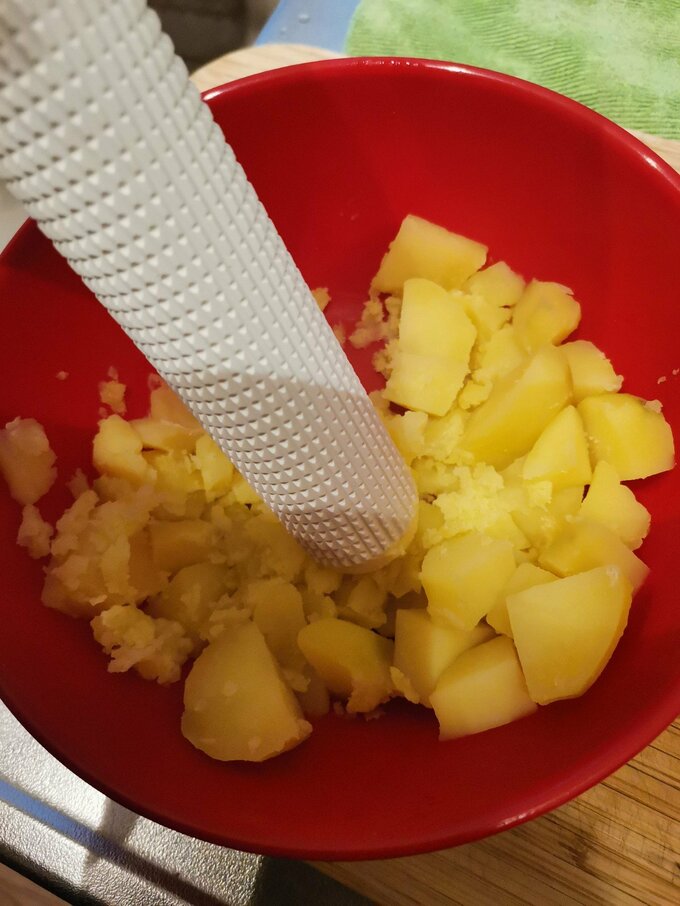 野菜はそれぞれレンジでチンして、フォークか麺棒などで潰す。