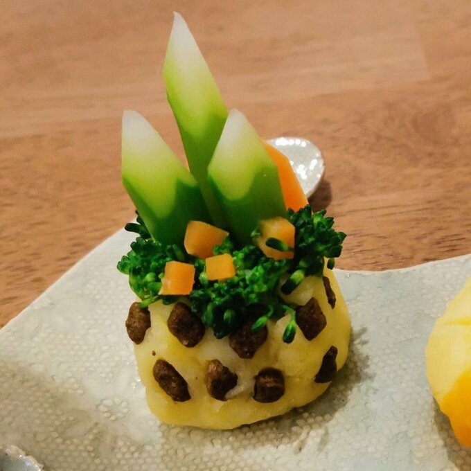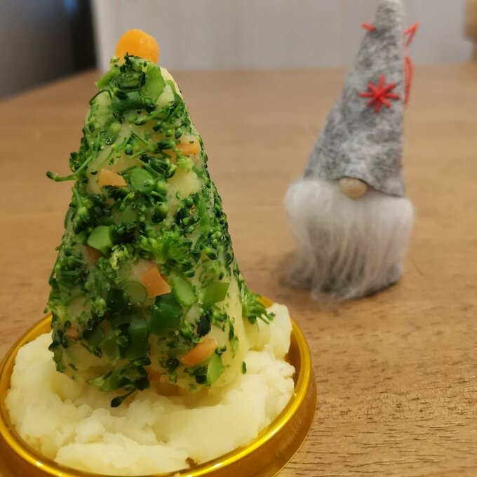 作り方は同じで、ジャガイモで円錐形を作り、みじん切りにしたブロッコリーのつぼみ部分を張り付ける。