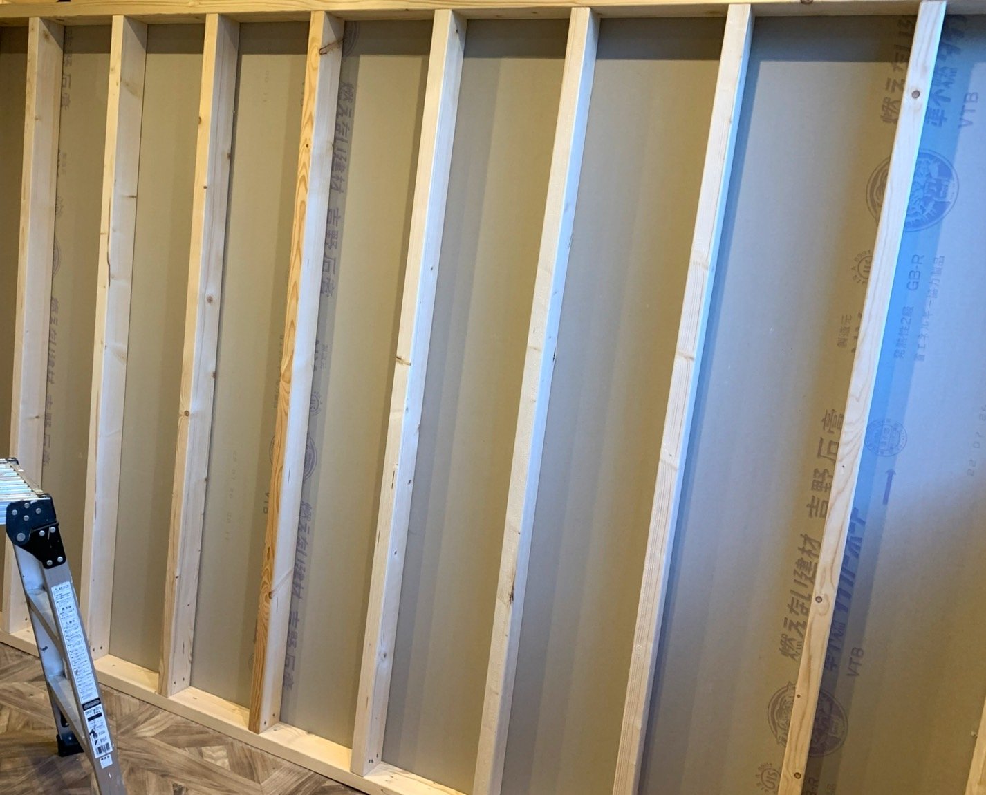 室内の壁には石膏ボードが使用されています。 その裏側には、30〜45㎝くらいの間隔で間柱があり、壁を支えています。これを下地と呼んでいます。