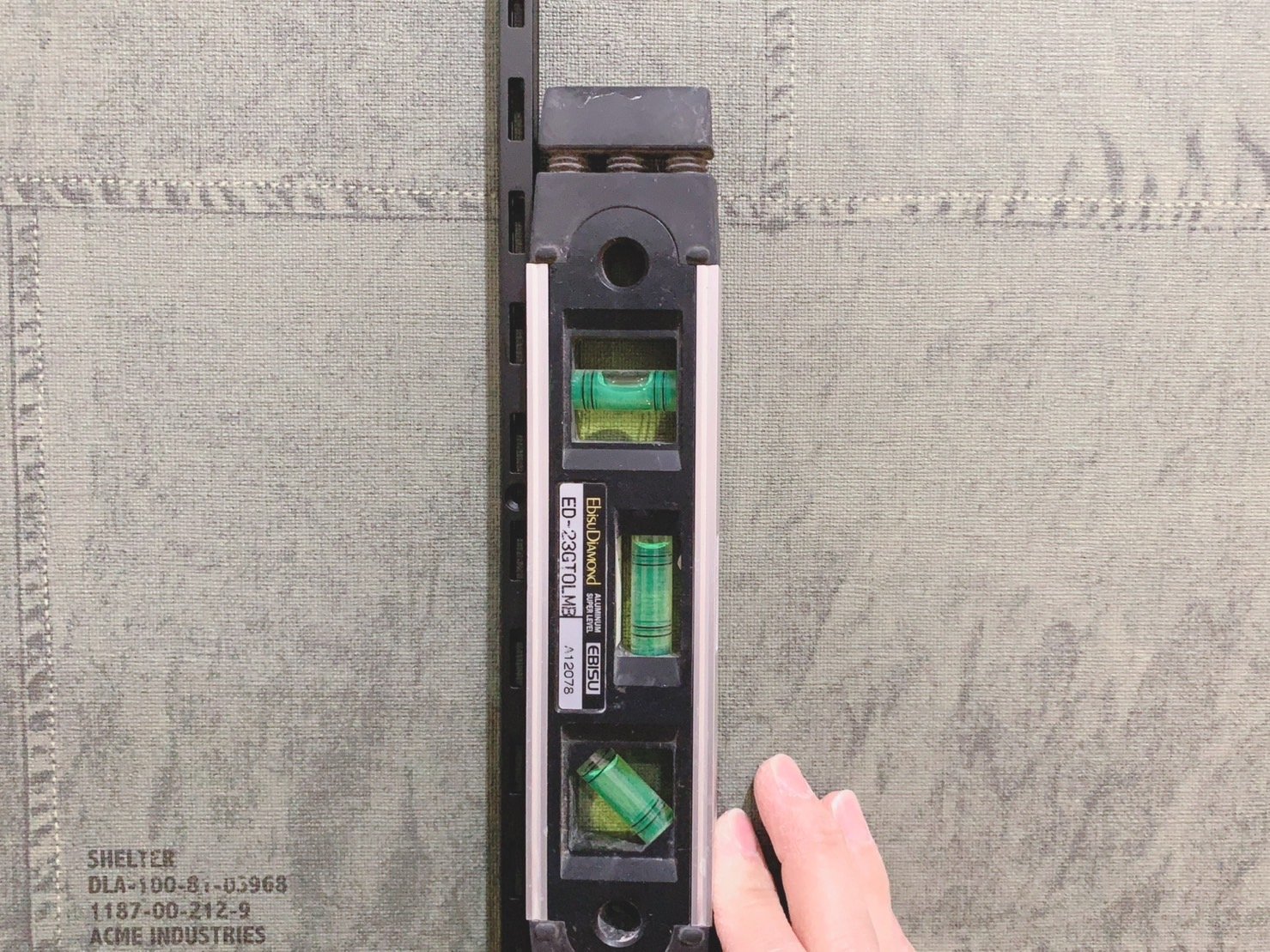 下地のある場所に水平器を使って垂直になる位置にマスキングテープや鉛筆で印を付け棚柱をビス止めします。