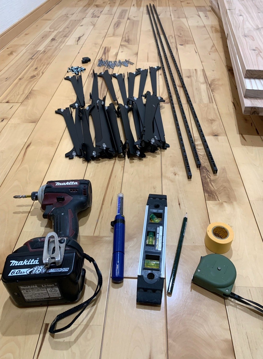 材料費は金具、柱、ブラケットで16,000円、棚板で8,500円で、合計で約24,500円でした。