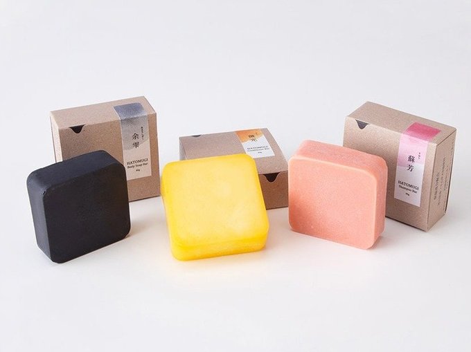 右から「シャンプーバー 蘇芳(すおう)」、「コンディショナーバー 微光(びこう)」(各2,750円)、「ボディソープバー 余雫(あまりしずく)」(2,200円)