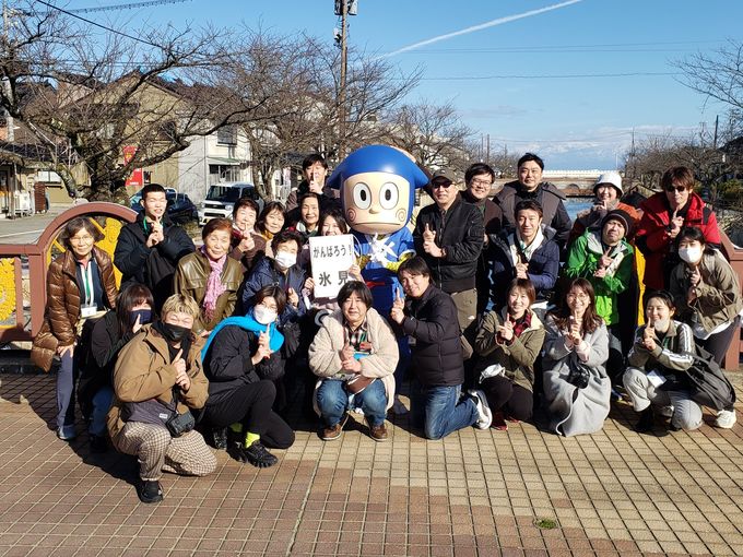 午後は氷見市の久目地区交流館へ。バスの中ではしまさんが氷見の魅力や見どころを紹介しました。交流館ではゆるスポーツ「ハンぎょボール(※2)」の体験をしました。氷見で盛んなハンドボールが土台で、出世魚として知られるブリの縫いぐるみを脇に挟んでプレーするユニークなスポーツです。参加者からは「想像以上にハードだったけど体を動かすことができて楽しい」「ブリの縫いぐるみを脇に挟んだだけで、急に難しくなる」などと感想を寄せられました。参加者はほとんどが初対面で年齢もばらばら。それでも、ゴールが決まると、「出世~!」の掛け声を合い言葉にあっという間に打ち解けました。