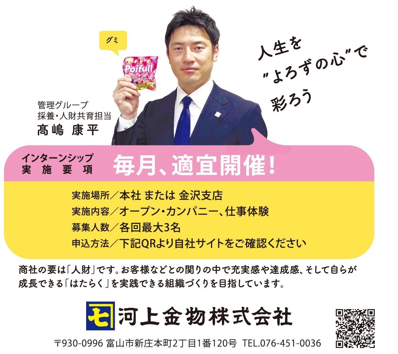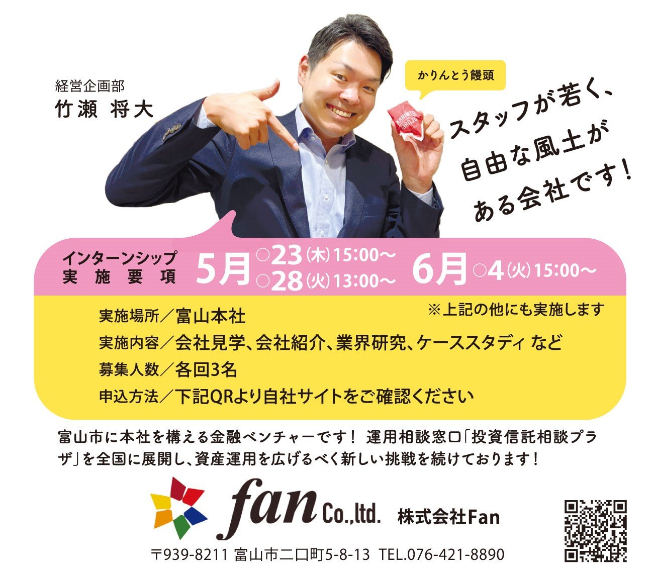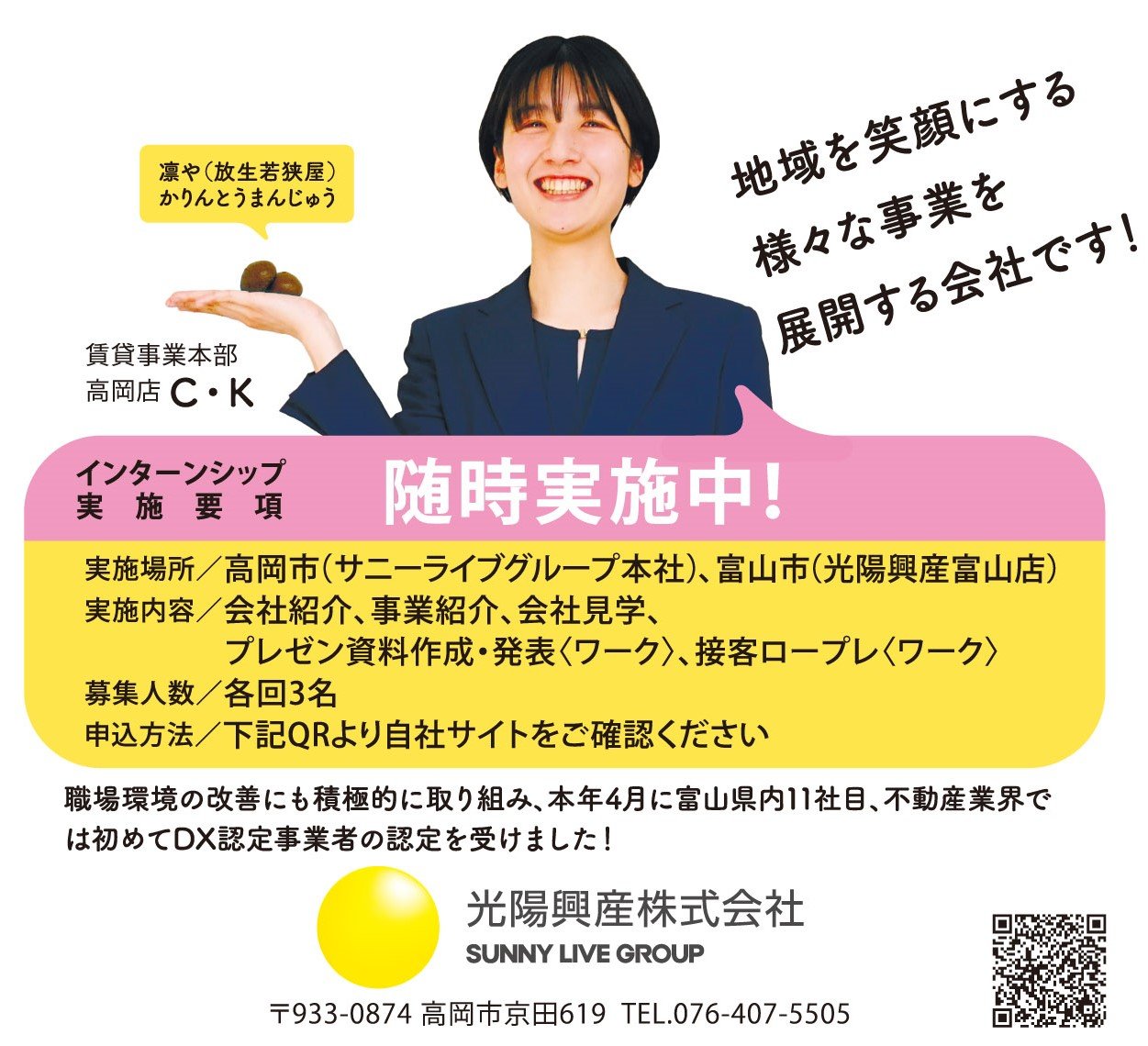 お菓子を食べながら、先輩社員たちと気軽にコミュニケーション!大学3年生、短大・専門1年生のみなさんを応援する就活イベントです。名刺交換会や企業交流会、顔タイプ診断(要予約)など、企業研究の第一歩に役立つ内容です。ここでご紹介する富山の元気な企業たちが、あなたとの出会いを心待ちにしています!!