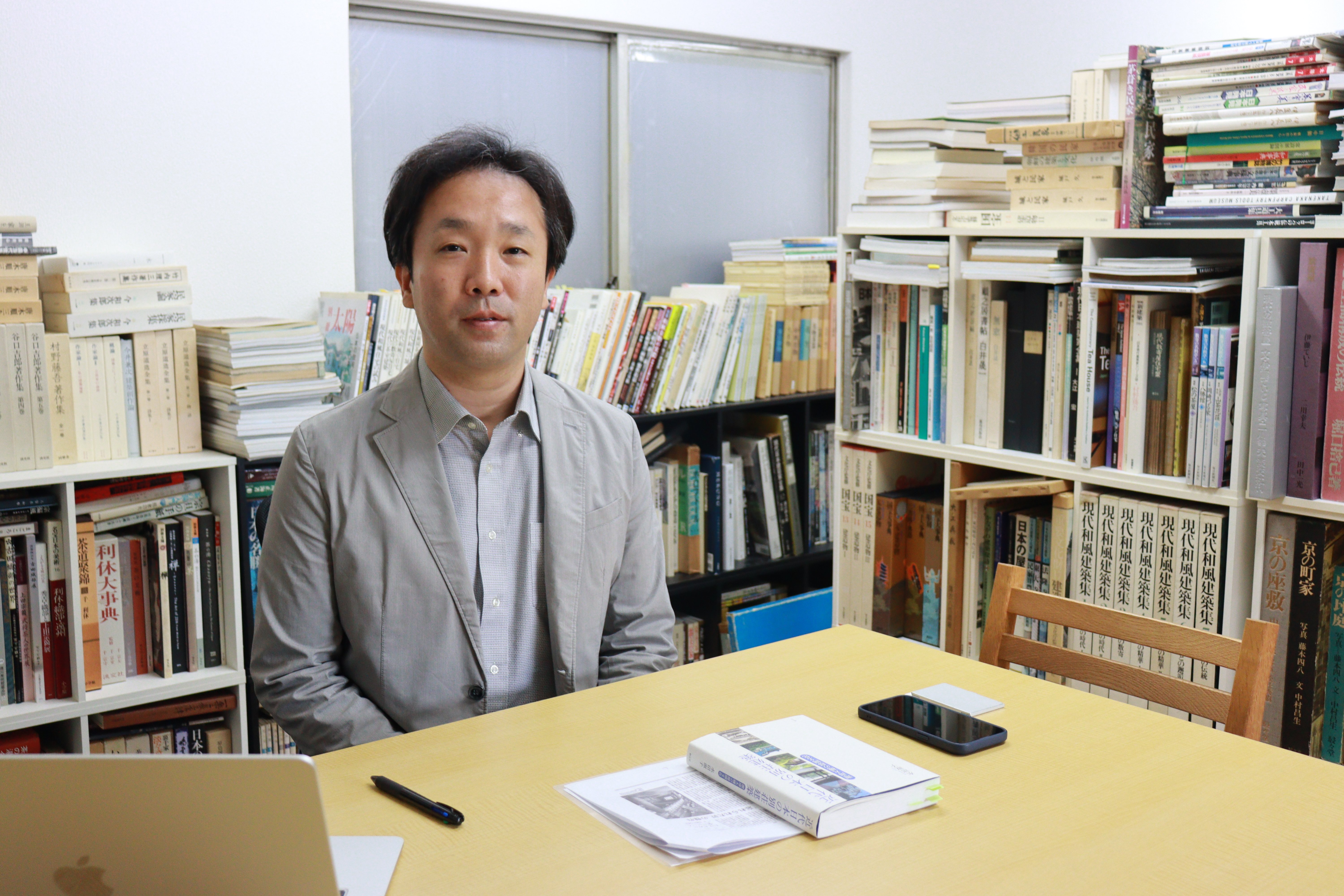 事務所で写真に納まる森本さん。棚には日本の伝統建築や茶道に関する本がぎっしりと収納されている=富山市泉町
