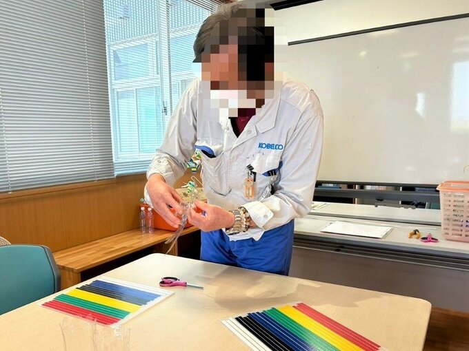 切ったペットボトルを折り曲げ、好きな色のテープを貼ったり油性マジックで絵を描いたりしました。