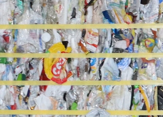「射水市ミライクル館」には、プラスチックやペットボトル、紙製容器包装、瓶といった資源ごみが集まります。中身の入ったペットボトルや汚れたプラ製容器包装などの再生できないごみを手作業で取り出し、再生工場に運びやすくするため、小さく圧縮してまとめています。