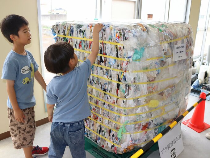 集まったペットボトルや、プラスチック・紙の容器包装は、約1m四方のかたまりに梱包されます。案内をしてくれた同館の鈴木公平さんは「一つ一つのプラスチックごみは軽いけど、圧縮すると約300キロの重さのかたまりになる」と教えてくれました。