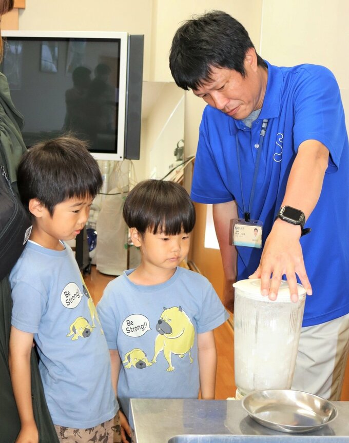 ミライクル館2階の体験工房で、牛乳パックを使った紙すきを体験しました。細かくカットした牛乳パックのかけらを水と一緒にミキサーにかけて溶かし、その液の中で金網を上下に動かしながら平らにし、乾燥させれば出来上がり!