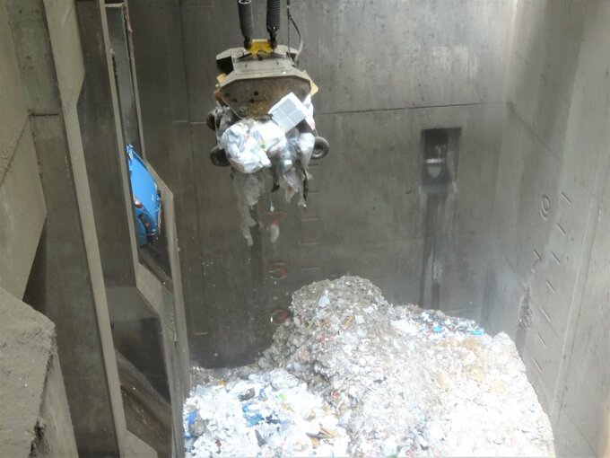 隣接する「クリーンピア射水」も見学しました。射水市内の家庭ごみを燃やす焼却炉があり、ごみ収集車約50台が、一日に計100トンのごみを運び込みます。燃やした時の熱を利用して電気を作り、得た電力のうち約6割を施設内で使い、残りを電力会社に売電しています。