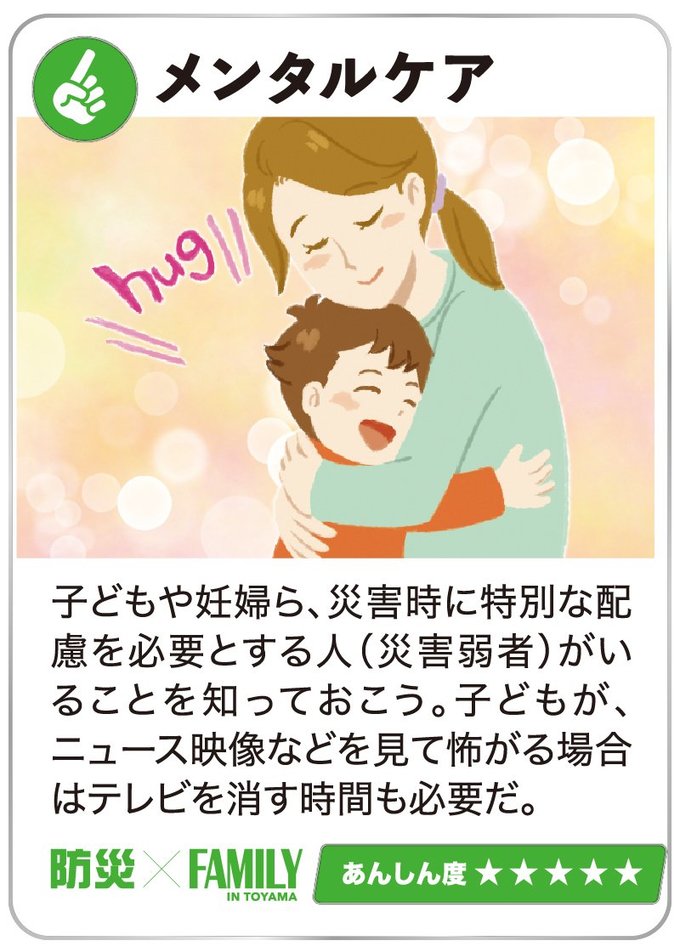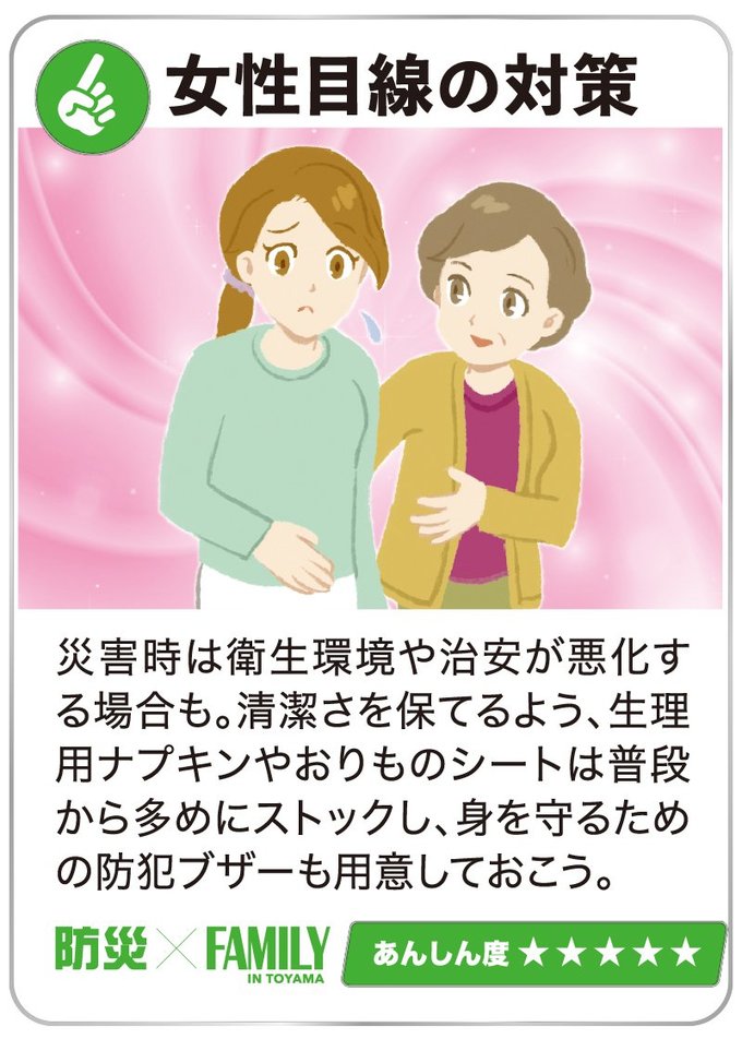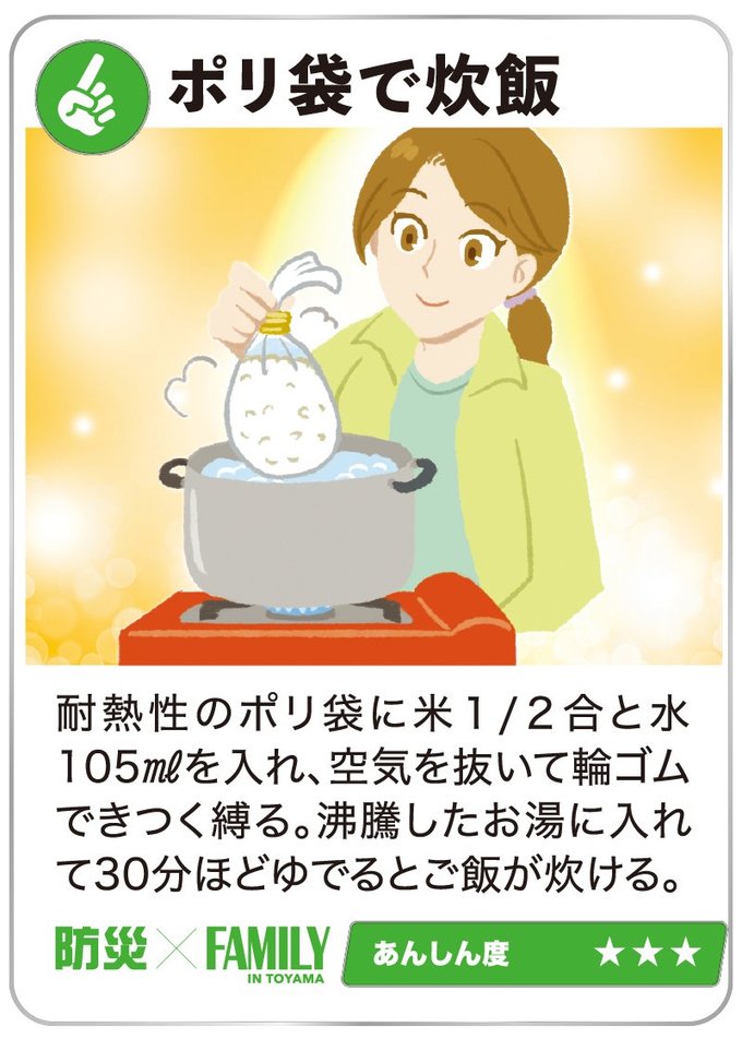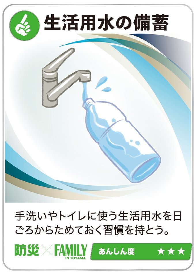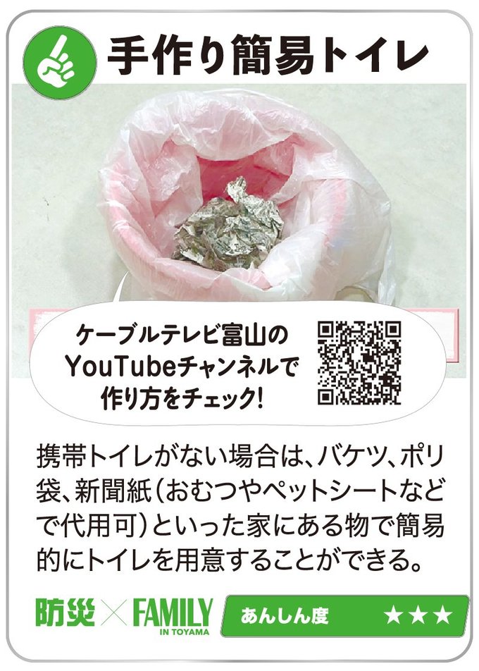生活の工夫も大事!避難生活に備えよう 2024年6月1日 09:00 災害時は限られた物資で命をつないでいかなければなりません。事前の備えや少しの知識が、長引く避難生活の助けとなります。 ケーブルテレビ富山のYouTubeチャンネル 食の備蓄はコレ!避難生活に備えよう 大震災後は、物流が混乱し、スーパーに行っても食料品がない!という事態が考えられます。最低でも3日分、できれば1週間分... 暮らしの備えはコレ!避難生活に備えよう ライフラインが止まった自宅は不便だらけです。少しでも快適に過ごすため、食品以外にも備えておきたい物がたくさんあります... 住宅設備はコレ!避難生活に備えよう 自宅を「安全・安心」な場所にするためには、耐震性能をまずは確認。在宅避難生活を快適にしてくれる優れた設備もあります。... 「『自分にとって』必要なもの蓄えよう」ママ防災士・鈴木佑実さんに聞く 1月に発生した能登半島地震から、半年が過ぎようとしています。地震後、皆さんの家庭では災害対策にどのような変化がありまし... 防災士さんに聞く!避難所へ行く判断基準は? 高齢の家族どうやって避難? 1月の能登半島地震を受け、翌月に発行したコノコトプラス10号の読者アンケートで地震対策についての疑問を集めたところ、約... いざというときのため、家族でどう備えれば…【防災×FAMILY】STEP2(2024年6月30日付 北日本新聞掲載) 1月1日に発生した能登半島地震から、半年が過ぎようとしています。皆さんの家庭では、今どのような地震対策をしていますか?... この機能は会員限定です。 お気に入りの記事を保存し、マイページで読むことができます。 ログイン 会員登録はこちら