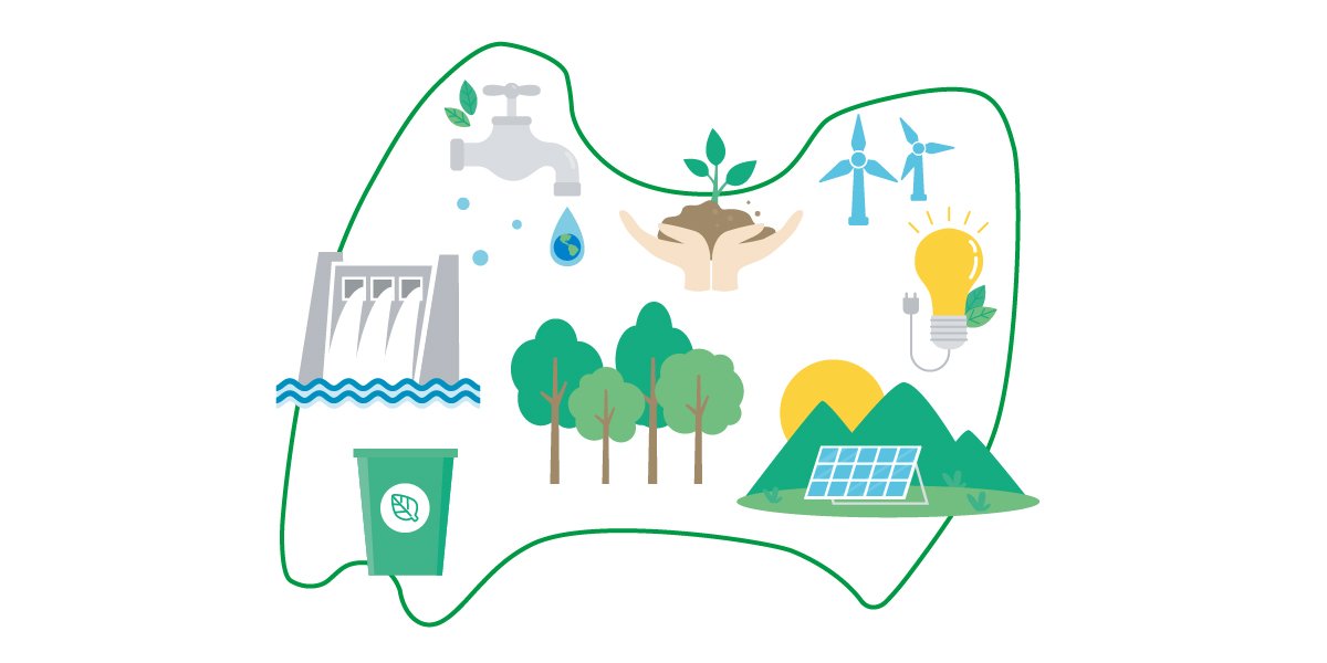 企業では、より少ないエネルギーで動く機械に入れ替えたり、太陽光や水力、風力発電など繰り返し使える自然のエネルギー「再生可能エネルギー」を取り入れたりしています。