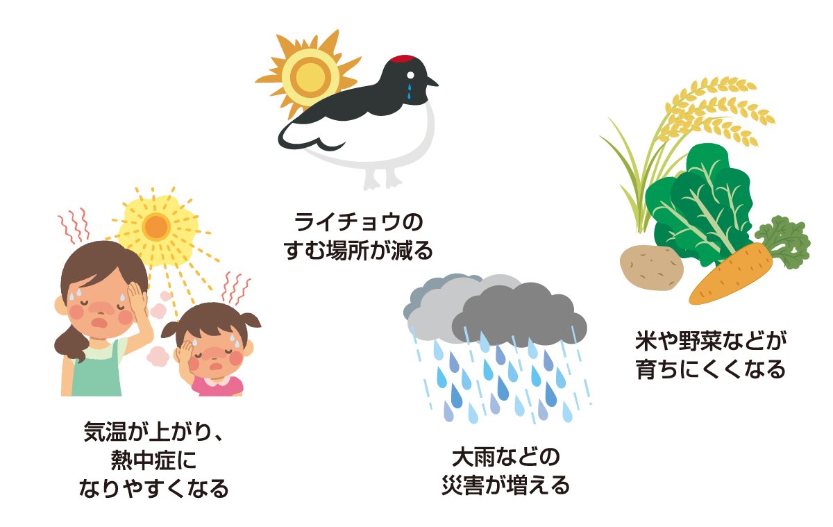 熱中症になりやすくなったり、大雨や洪水などの災害が増えたり、富山のおいしいお米や野菜の質が下がったり、とれる量が減ったりして、私たちの健康や暮らしに大きく影響が出ます。また暑い場所では生きていけない動植物もいます。ライチョウがすむ場所も減ってしまうかもしれません。